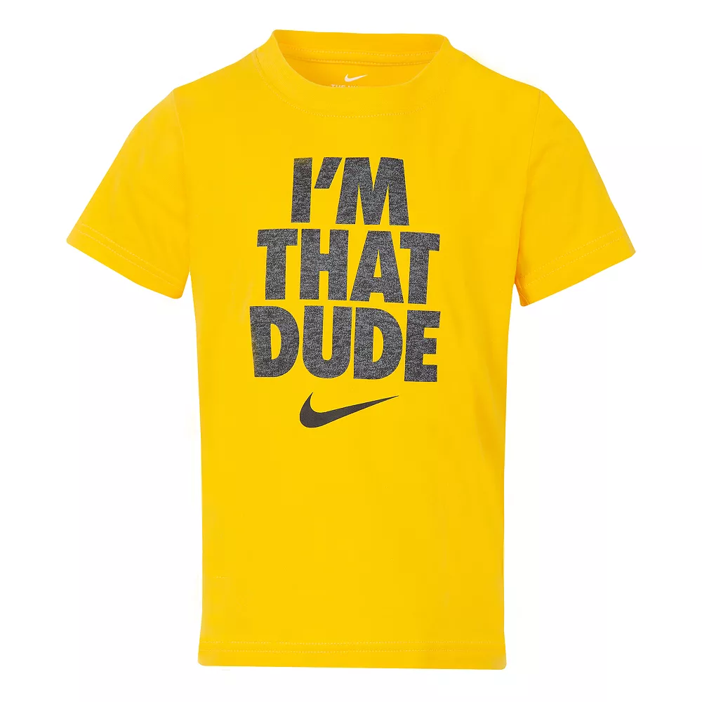 This cool graphic tee by Nike keeps up with his humor. In yellow.