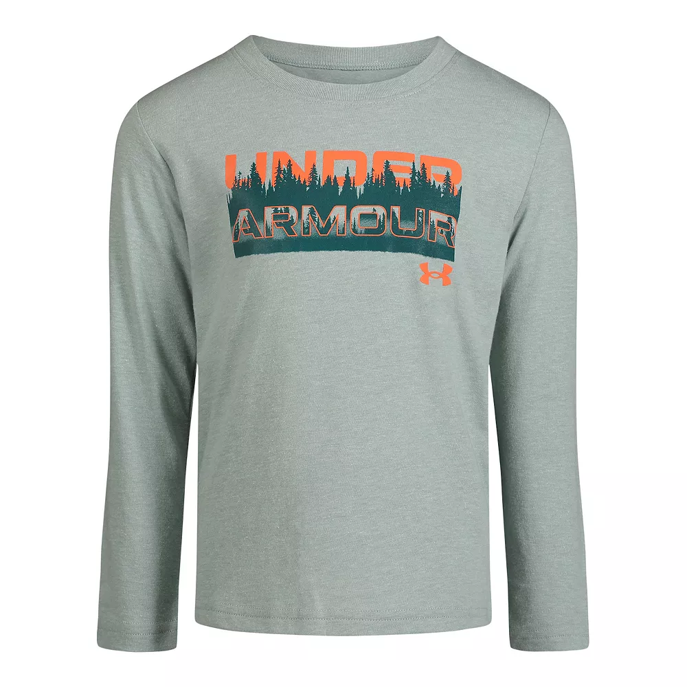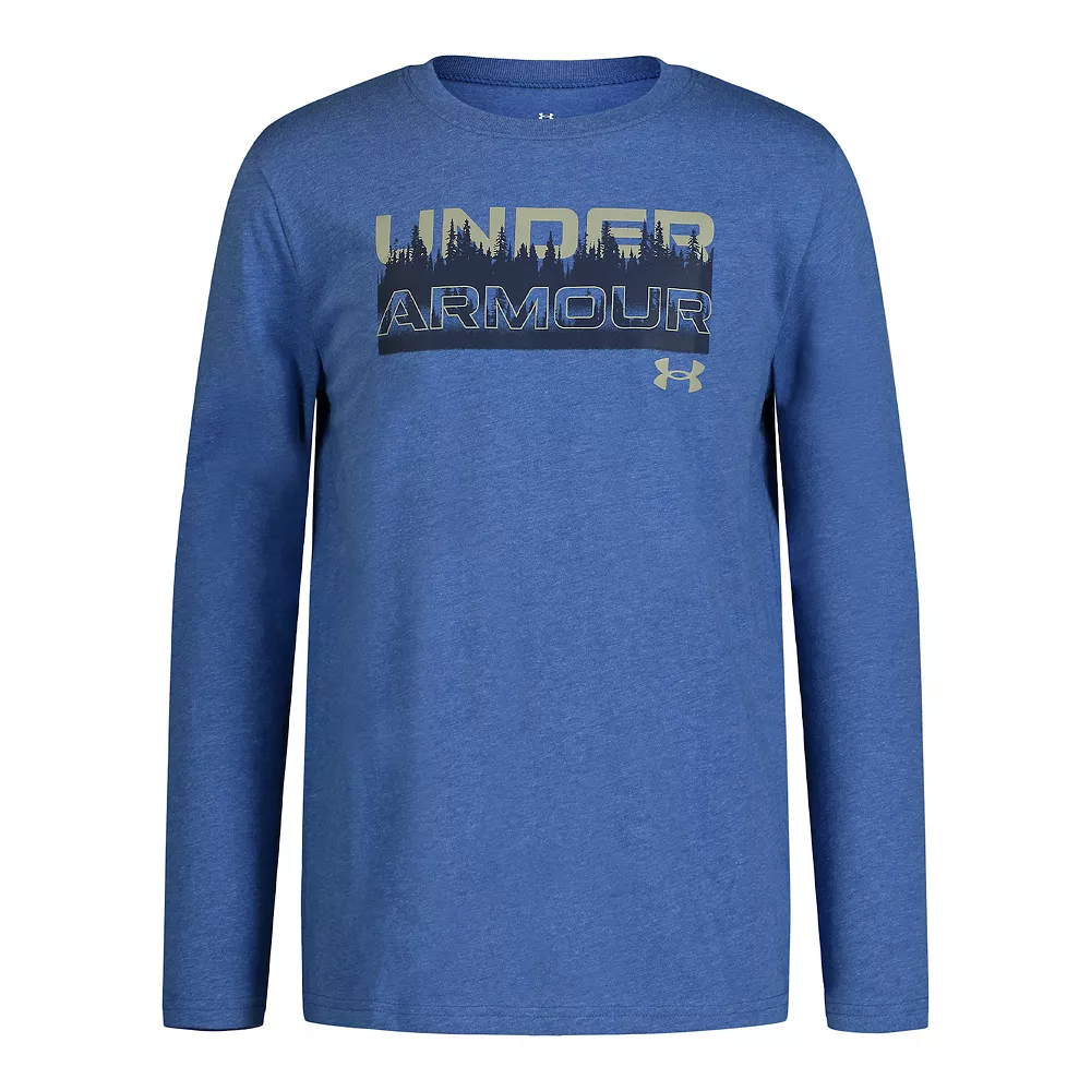 He’ll be ready to explore the great outdoors in this boys’ long sleeve wordmark graphic tee from Under Armour.
