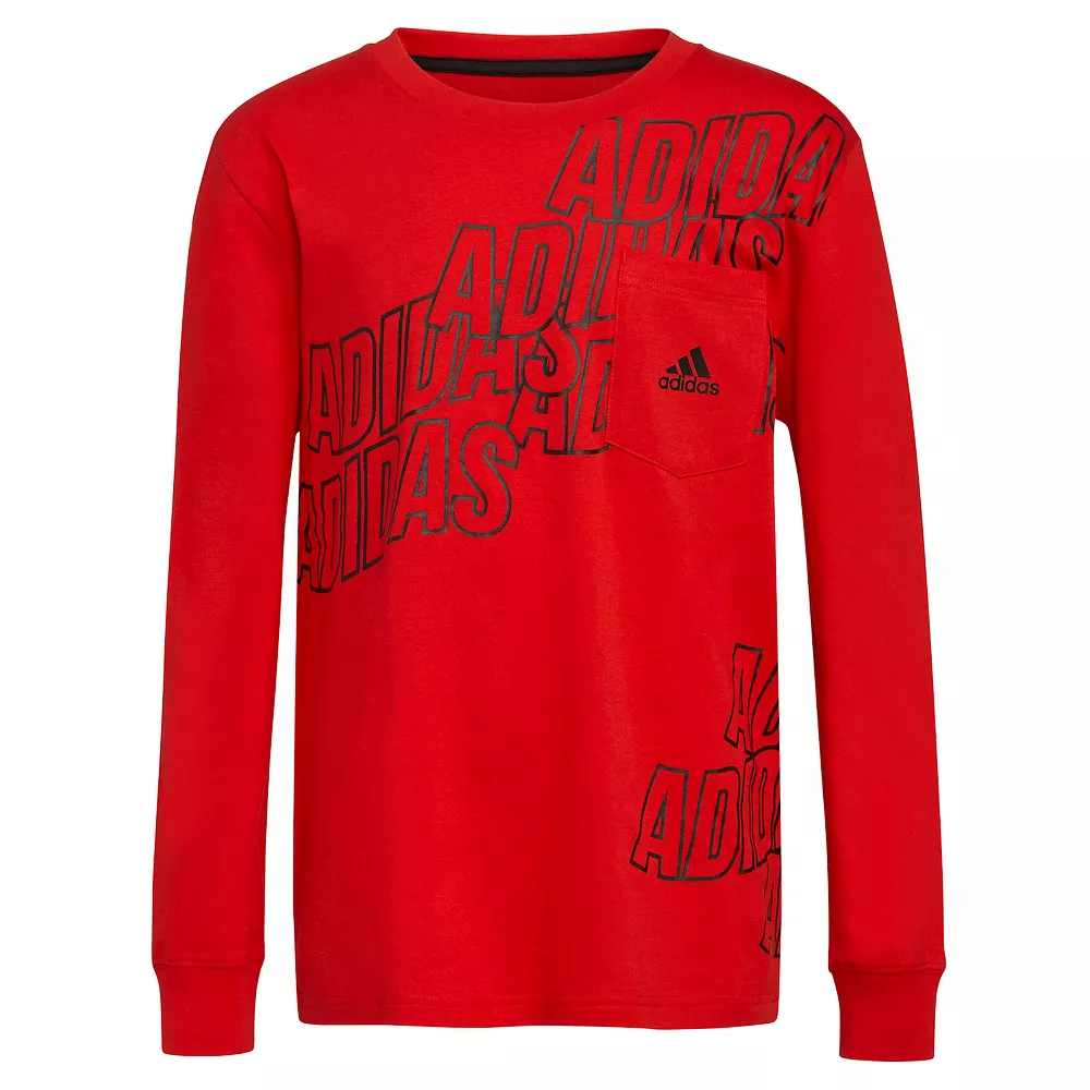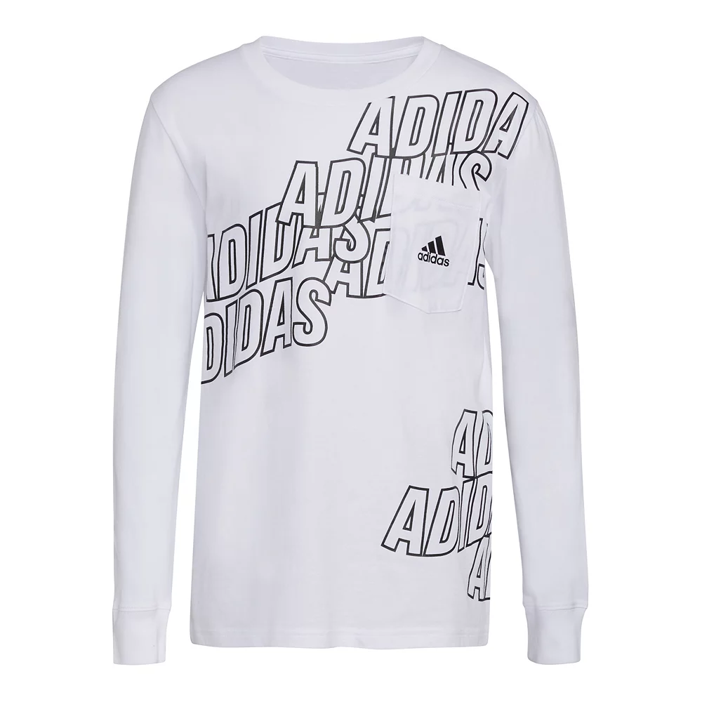 He can never have too many long sleeve tees. This one is covered in an allover adidas print. Made of soft all-cotton jersey, this boys’ long sleeve t-shirt is finished with a single patch pocket on the chest.