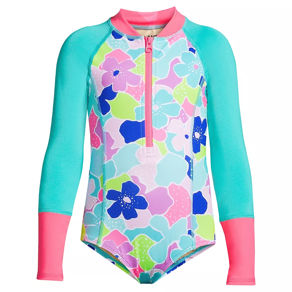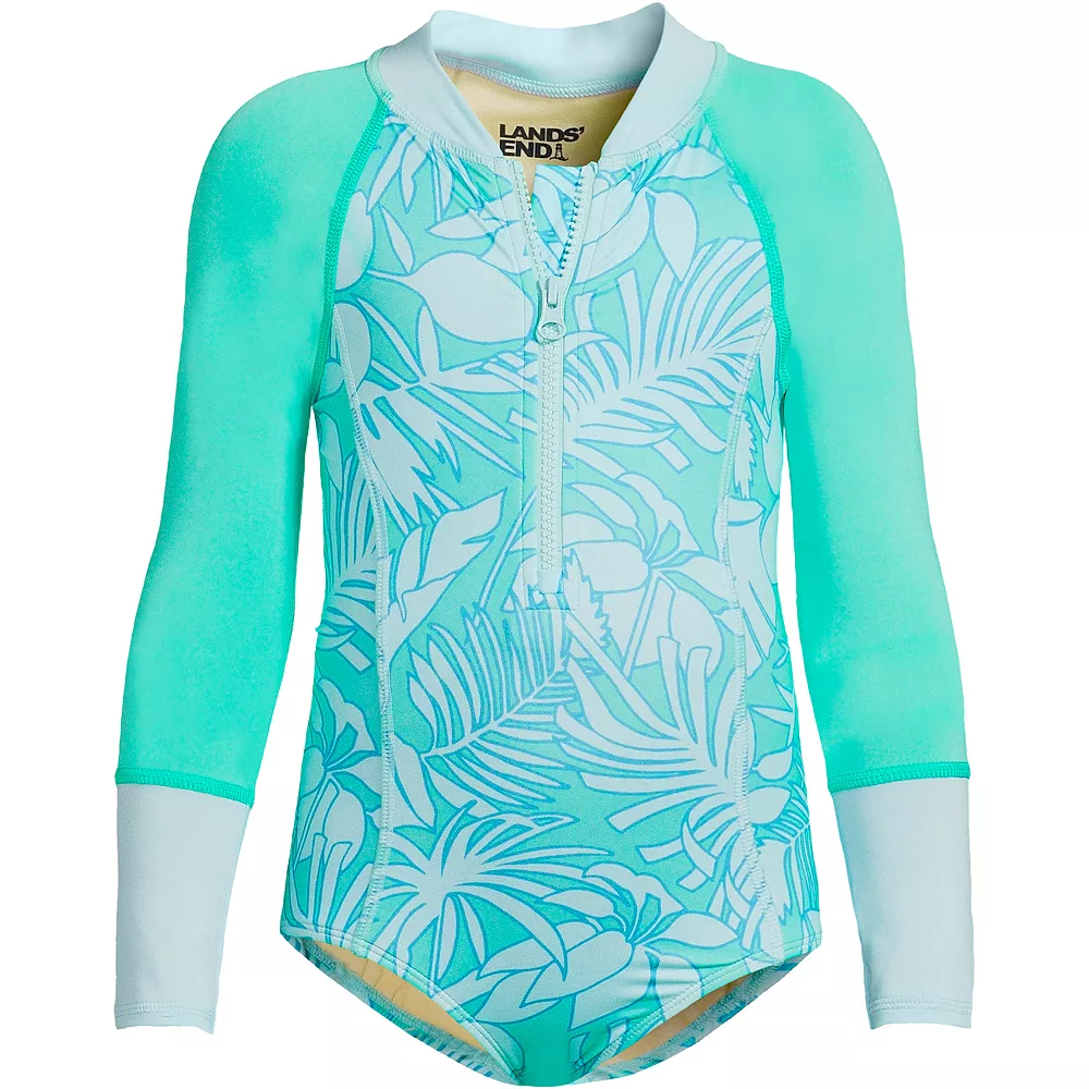 She’ll be cute and protected from the sun wearing this girls’ Lands’ End long-sleeved swimsuit.