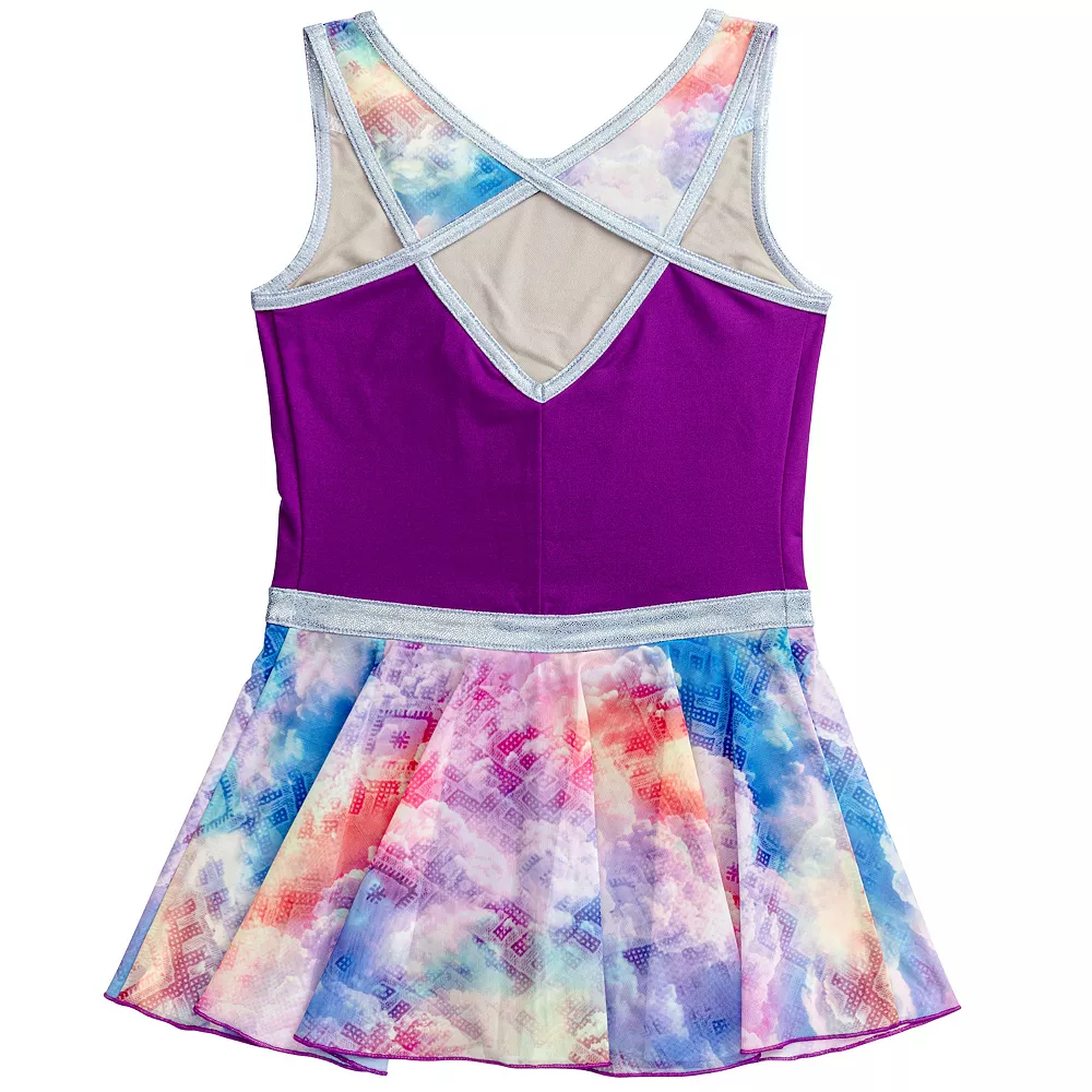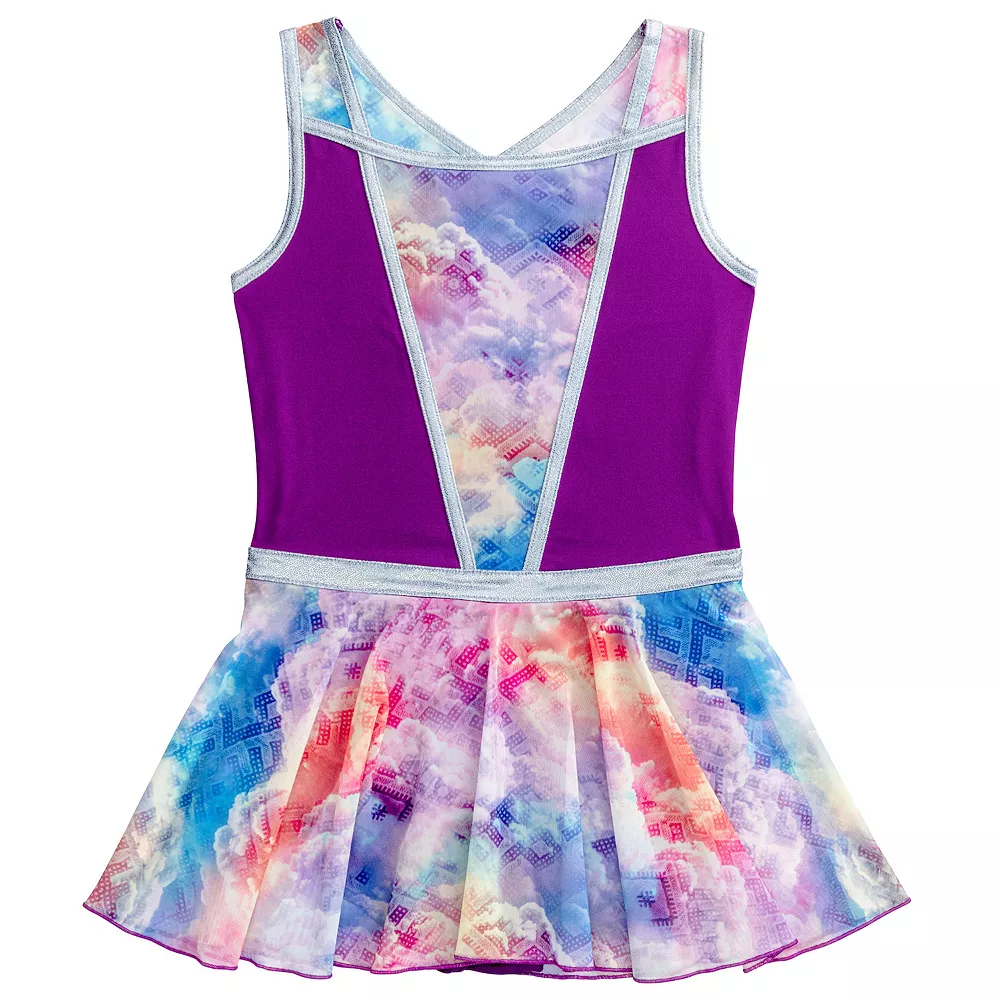 She’ll love the chic pattern and comfy flexibility of this sleek girls’ Rainbeau Moves print skirted leotard.