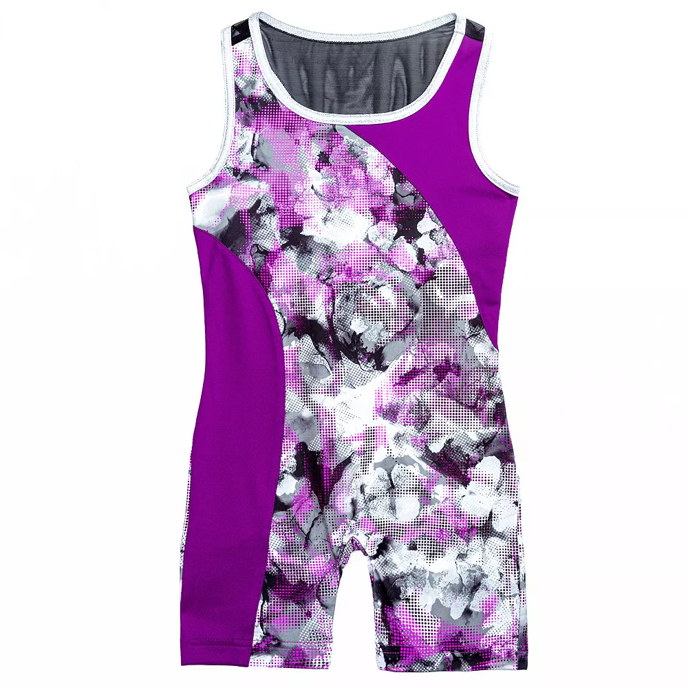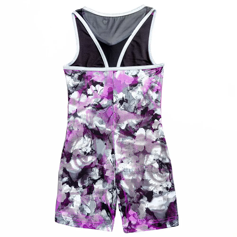 She’ll love the chic pattern and comfy flexibility of this sleek girls’ Rainbeau Moves printed biketard with mesh back.
