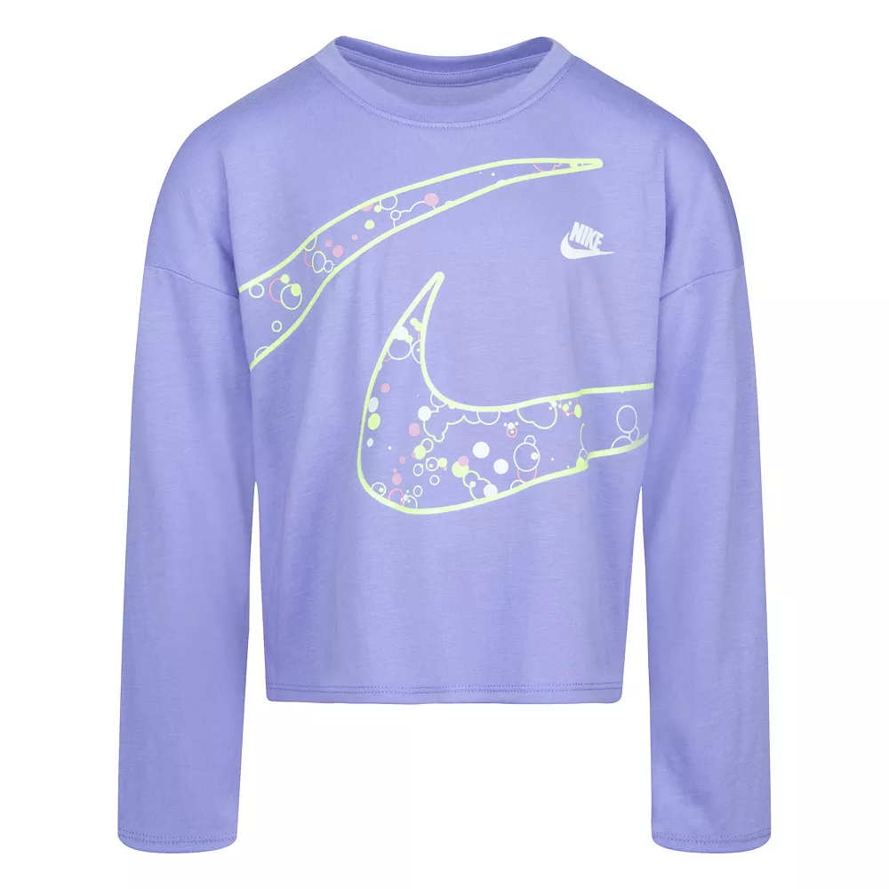 Give her wardrobe a refresh with this eye-catching girls’ long sleeve logo graphic tee from Nike.