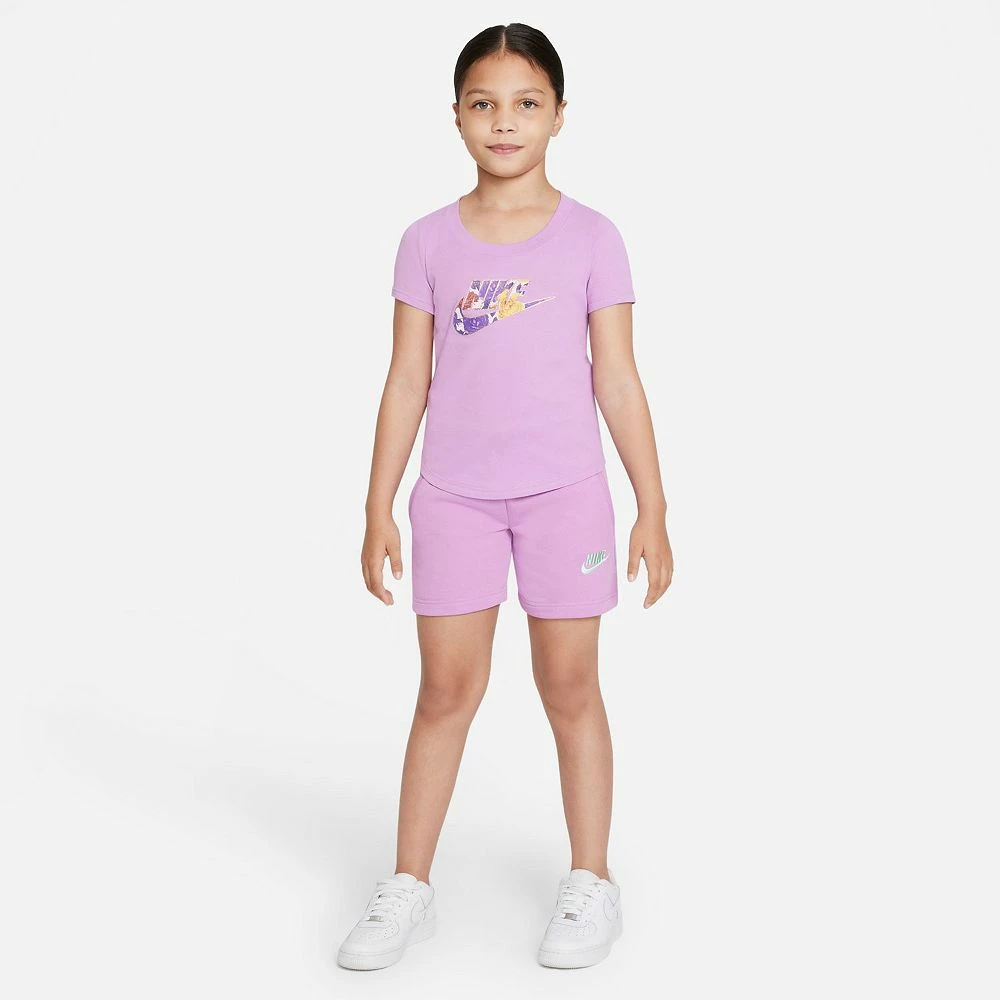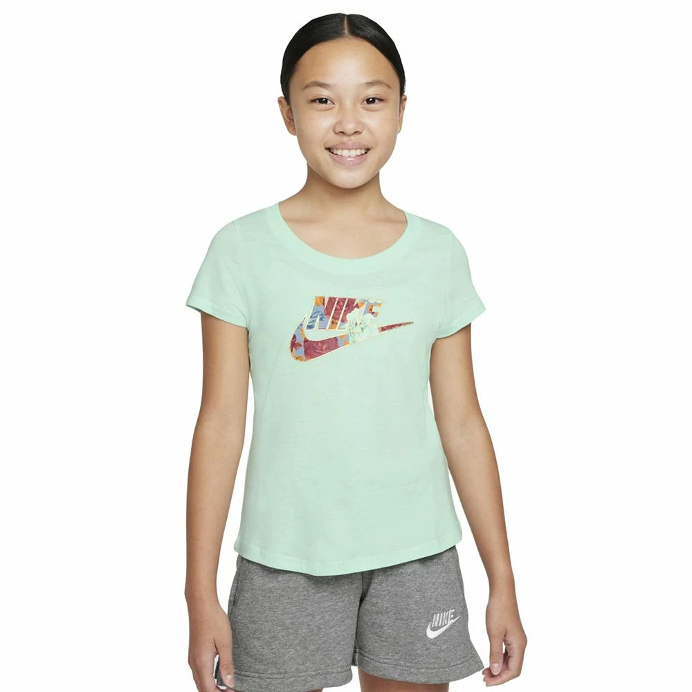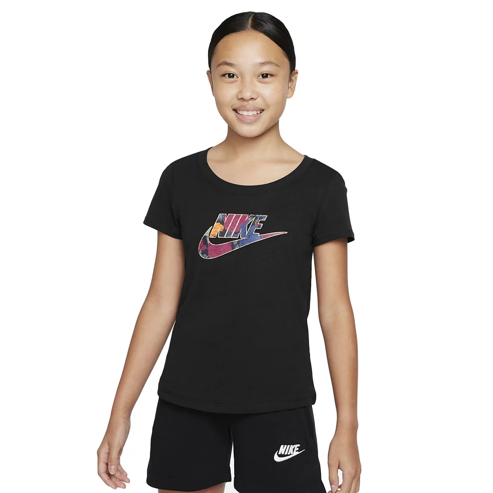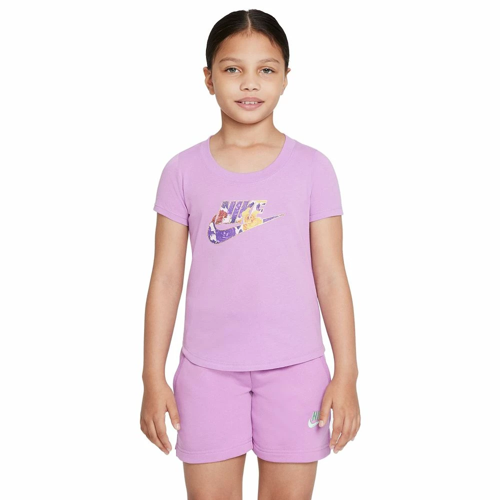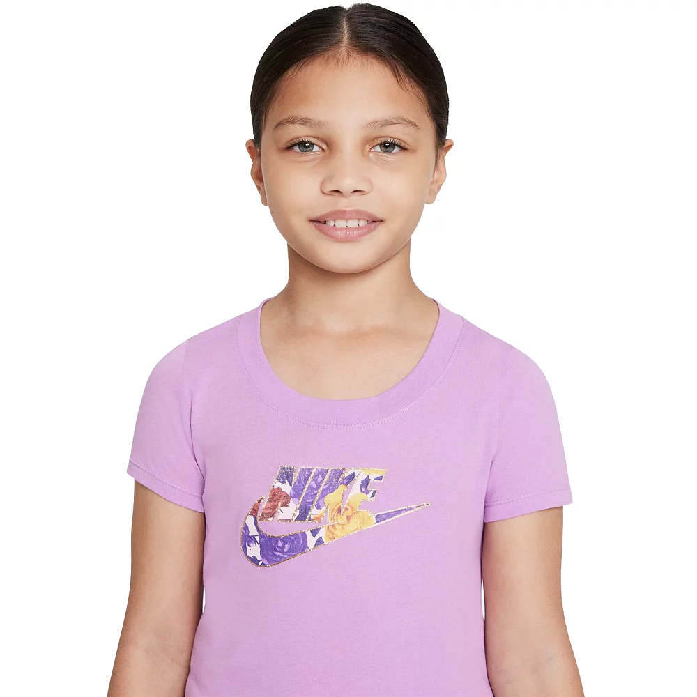 A gold and floral Nike graphic give this girls’ tee a cute, sporty vibe.