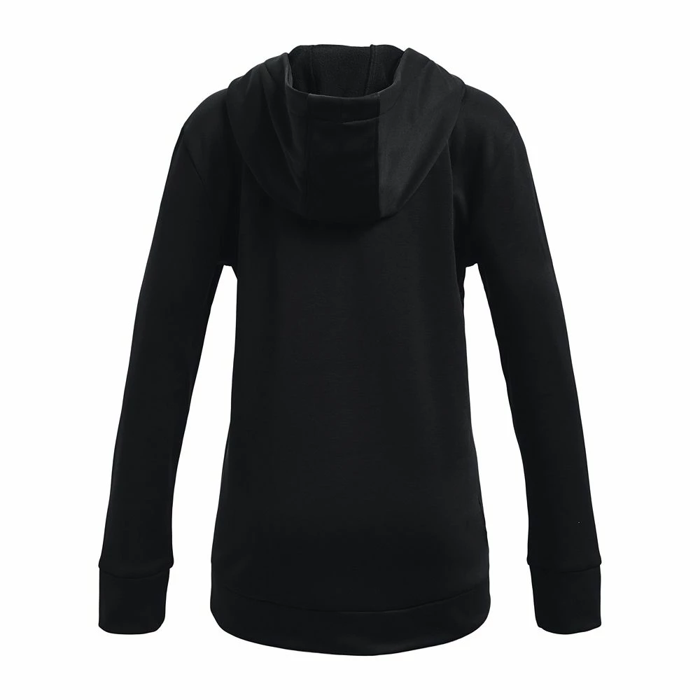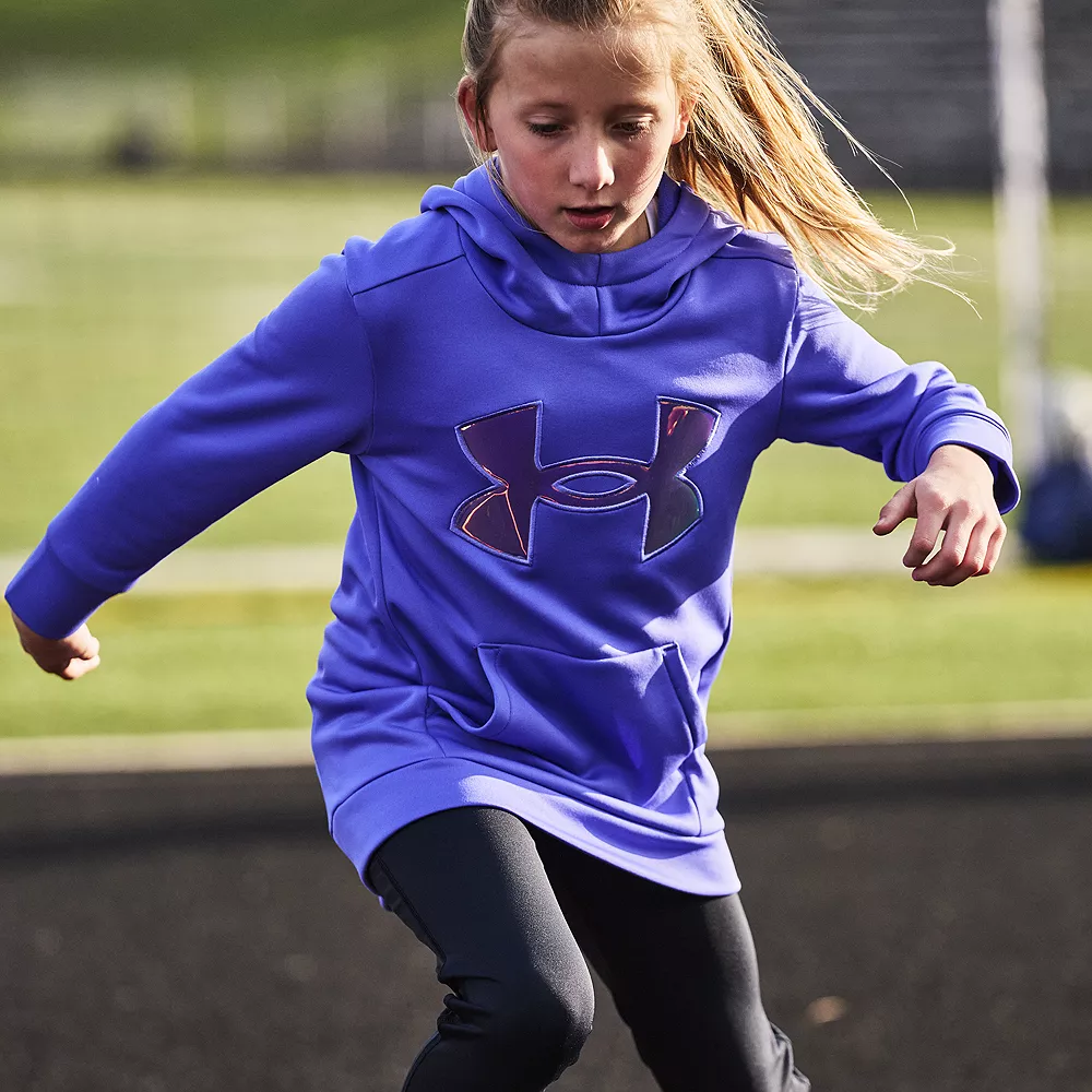 This Under Armour girls’ fleece hoodie features an eye-catching iridescent logo graphic.